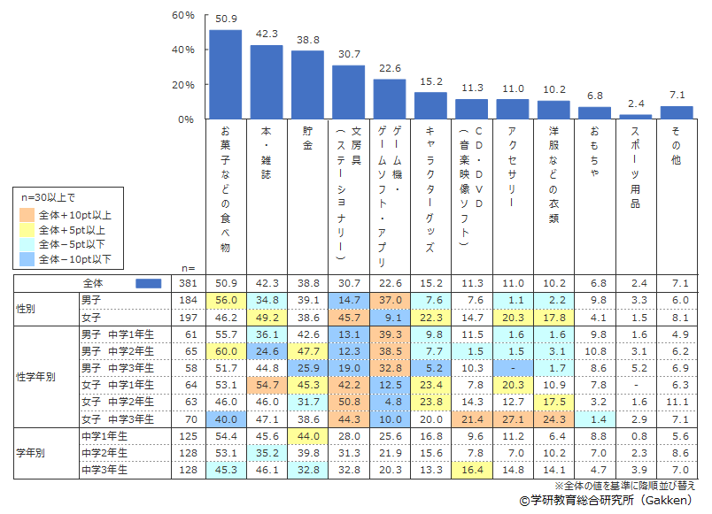 男女別にみると、男子では「お菓子などの食べ物」が56.0%(女子46.2%)、「ゲーム機・ゲームソフト」が37.0%(女子9.1%)に対し、女子では「本・雑誌」が49.2%(男子34.8%)、「文房具(ステーショナリー)」が45.7%(男子14.7%)と、その用途に大きく違いがあることがわかる。