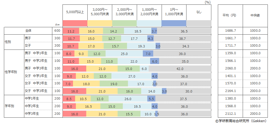 調査の結果、中学生全体の平均金額/月は1,686円であることがわかった。2017年度調査時(平均金額1,660円)と比較すると、微増傾向にある。学年別にみると、中学1年生の平均金額が1,380円、2年生が1,568円、3年生が2,112円であることから、学年が上がるにつれて増額していく様子が見て取れる。