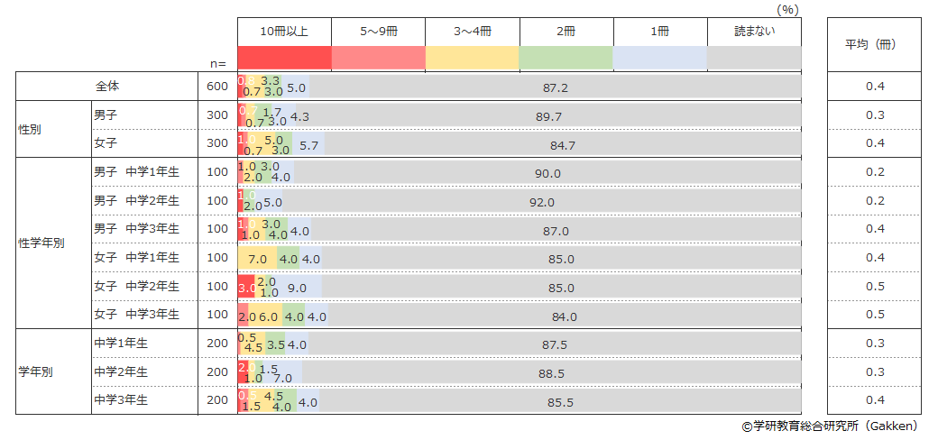 学年別の読書量の差は大きくないが、学年が上がるにつれ減少する傾向にある。一方、男子と女子の差は大きく、女子が男子の1.7倍の本を読んでいるという結果となっている。
