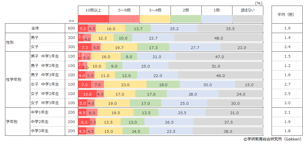 中学生の1か月の読書量は平均1.9冊となり、小学生の平均3.0冊を大きく下回り、2017年度調査結果の平均2冊とほぼ変わらない結果となった。
