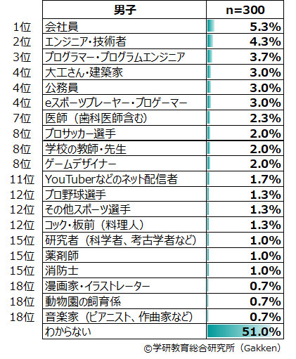 男子全体の人気上位は、1位「会社員」(5.3%)、2位「エンジニア・技術者」(4.3%)、3位「プログラマー・プログラムエンジニア」(3.7%)という結果になった。これらは学年別の統計でもそれぞれ10位以内に入る、男子に人気の職業といえるだろう。特に1位「会社員」は全学年において1位で、人気のほどがうかがえる。