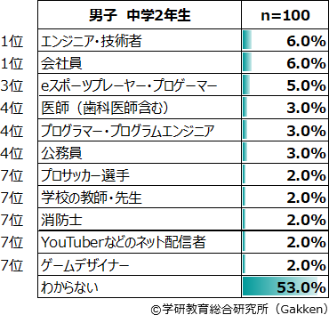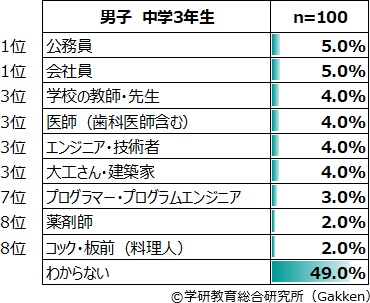 一方で、大きく順位を落としたのは「研究者(科学者、考古学者など)」である。2017年度調査では男子ランキングで3位(5.0%)であったが、今回は15位(1.0%)となった。各学年で見ても10位以内から陥落している。