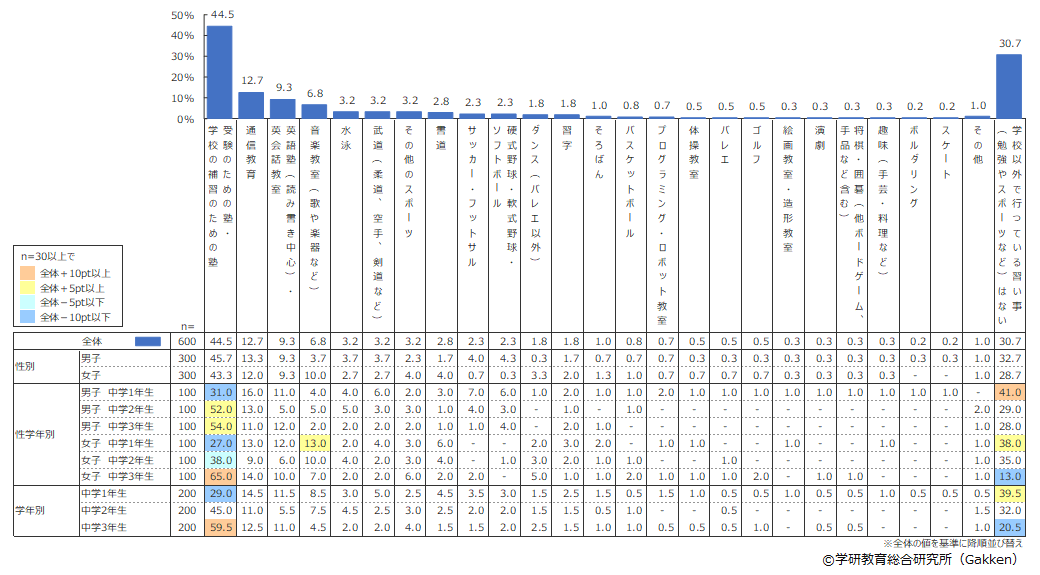 一方、中学生の習い事で1位となった「受験のための塾・学校の補習のための塾」は、小学生18.1%→中学生44.5%と大きく増加しており、2位の「通信教育」(12.7%)を大きく引き離す結果となっている。とくに中学3年生では6割近くに達することから、高校入試の備えのために通塾していることがうかがえる。また、2017年度調査結果と比較しても、通塾の割合は当時の36%より1割ほど高くなっている。