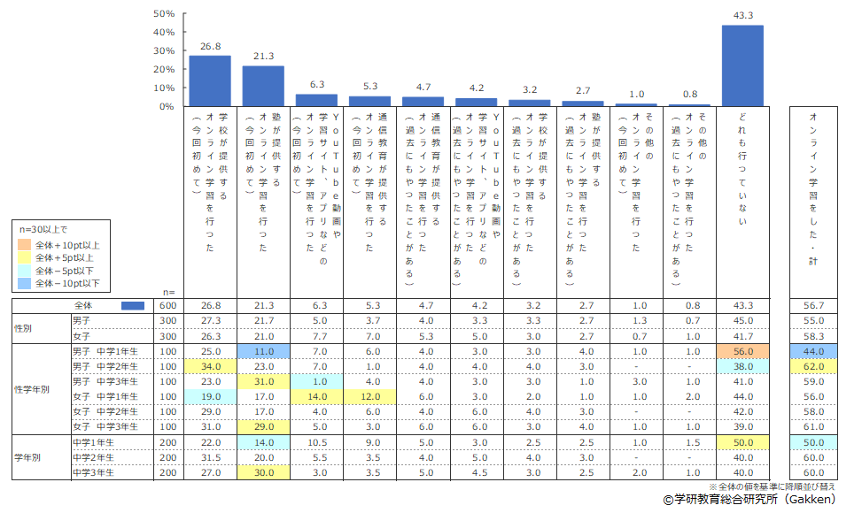 全体では56.7%が該当し、学年別では中学2・3年生が最も多い60.0%、1年生が若干少ない50%となった。今回初めてオンライン学習を行った割合をみると、オンライン学習の提供元については、学校(26.8%)と塾(21.3%)に二分され、1・2年生は学校から提供される割合のほうが高い(1年生:学校22.0%、塾14.0%、2年生:学校31.5%、塾20.0%)のに対し、3年生は学校からの提供が27.0%、塾からの提供が30.0%で、3学年で唯一塾から提供されて実施した割合が学校からの提供を上回り、受験学年ならではの違いが出ている。