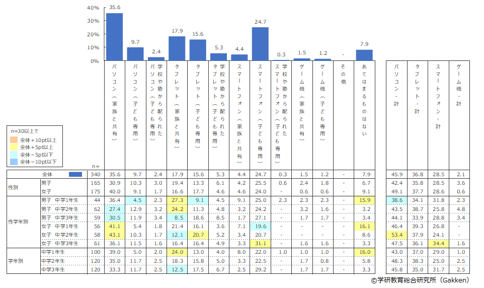 学年により多少の違いはあるにせよ、多くは「パソコン」(45.9%)、「タブレット」(36.8%)を利用し、「スマートフォン」を使った子どもは28.5%だった。