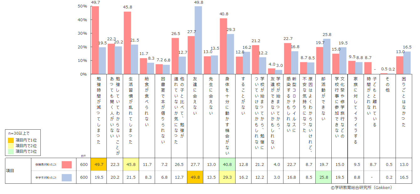 保護者の1位は「(子どもの)勉強時間が減ってしまった」(49.7%)、2位は「(子どもの)生活習慣が乱れてしまった」(45.8%)、3位は「(子どもが)身体を十分に動かす機会がない」(40.8%)という結果となり、いずれも40%を超えている。それ以降の5位「他の子と比べて、(子どもの)勉強が遅れていないか気になった」(26.5%)、7位「(子どもが)勉強していてわからないことがあっても聞く人がいない」(22.3%)、8位「学校が始まってから、(子どもが)勉強についていけないかもしれない」(21.2%)などを見ても、中学生の保護者の関心の多くは、勉強に向けられていることがうかがえる。