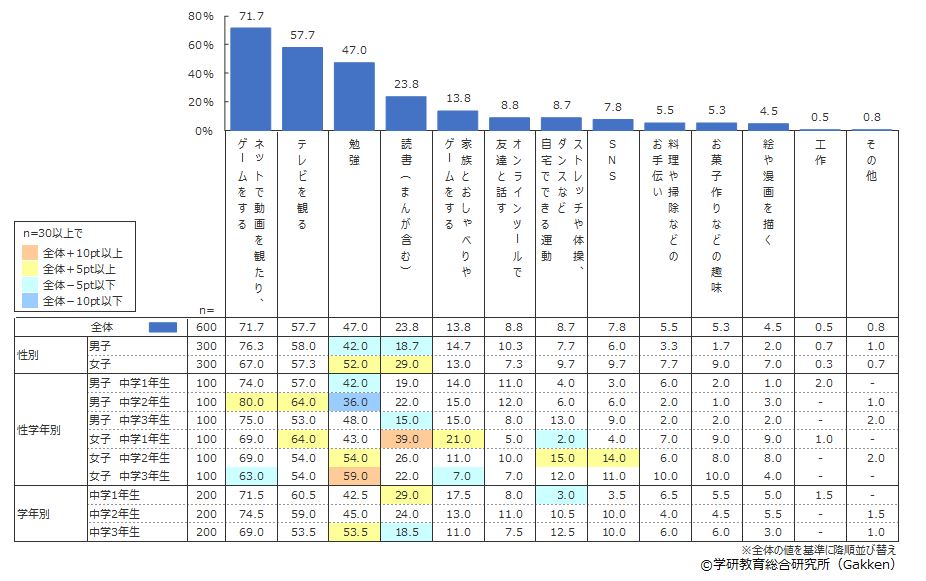 1位は「ネットで動画を観たり、ゲームをする」(71.7%)、2位は「テレビを観る」(57.0%)、3位が「勉強」(47%)という結果となった。