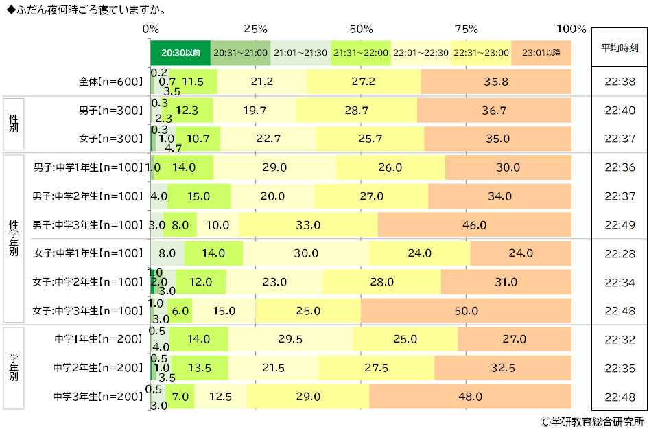 学年別にみると、平均時刻は上の学年ほど遅くなる傾向がみられ、3年生では22:48でした。