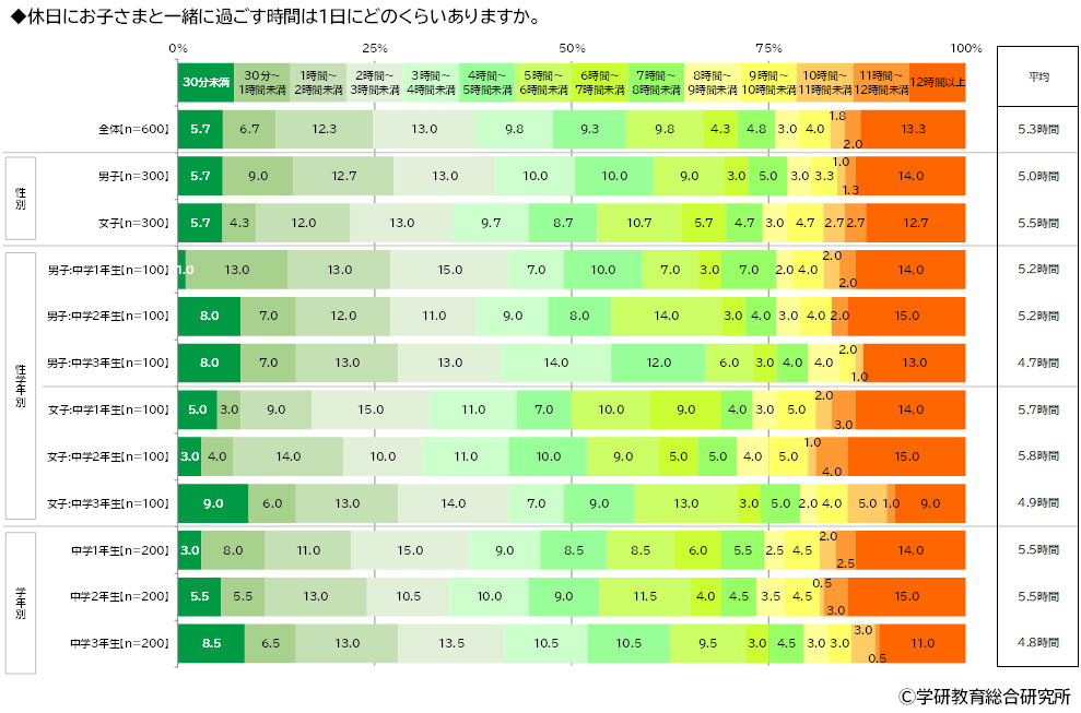 保護者に、休日に子どもと一緒に過ごす時間は1日にどのくらいあるかをきいたところ、「1時間~2時間」(12.3%)や「2時間~3時間」(13.0%)、「12時間以上」(13.3%)を答えが分かれ、平均は5.3時間でした。 学年別にみると、一緒に過ごす時間の平均は、1・2年生(いずれも5.5時間)と比べて3年生では4.8時間と0.7時間短くなりました。