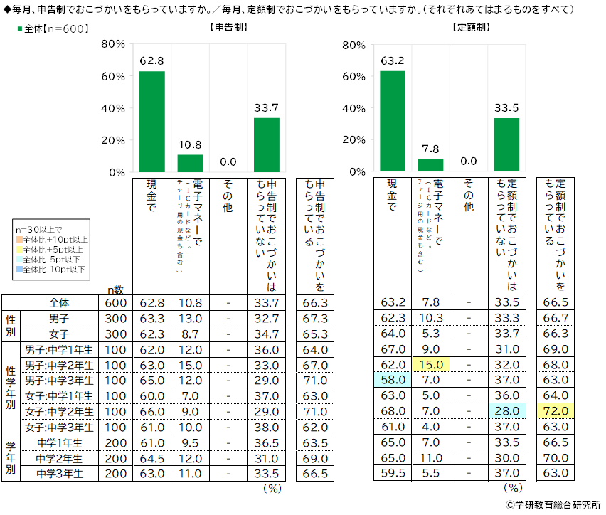 毎月、申告制でおこづかいをもらっているかをきいたところ、「現金で」は62.8%、「電子マネーで(ICカードなど。チャージ用の現金も含む)」は10.8%、「申告制でおこづかいはもらっていない」は33.7%となりました。また、毎月、定額制でおこづかいをもらっているかきいたところ、「現金で」は63.2%、「電子マネーで」は7.8%、「定額制でおこづかいはもらっていない」は33.5%となりました。