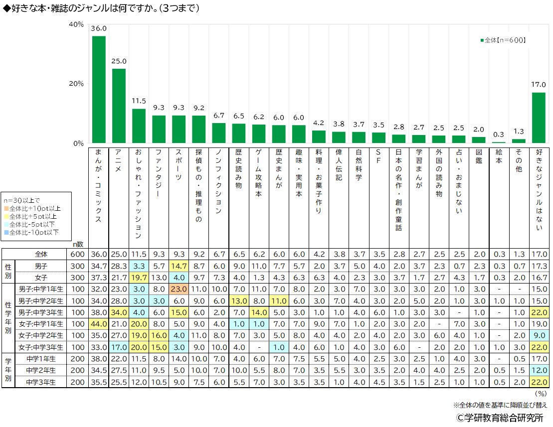 好きな本・雑誌のジャンルをきいたところ、1位「まんが・コミックス」(36.0%)、2位「アニメ」(25.0%)、3位「おしゃれ・ファッション」(11.5%)、4位「ファンタジー」「スポーツ」(いずれも9.3%)となりました。