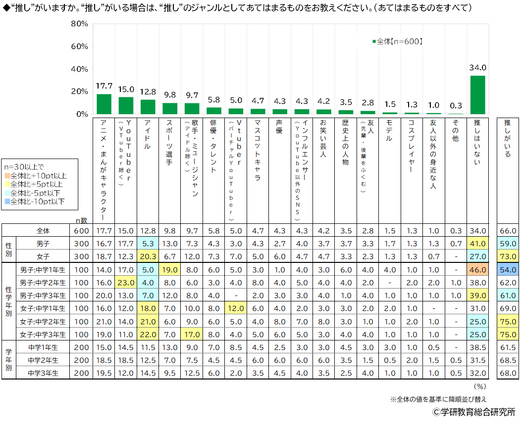 男女別にみると、推しがいる人の割合は女子では73.0%と、男子(59.0%)と比べて14.0ポイント高くなりました。また、推しのジャンルは男子では「YouTuber(VTuber除く)」、女子では「アイドル」が1位でした。