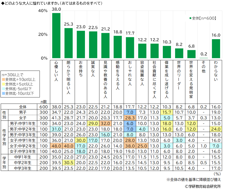 どのような大人に憧れているかをきいたところ、1位「心優しい人」(38.0%)、2位「朗らかで明るい人」(25.3%)、3位「お金持ち」(23.0%)、4位「誠実な人」(22.5%)、5位「見識や教養のある人」(21.2%)となりました。 男女別にみると、男子・女子ともに1位は「心優しい人」で、男子では「誠実な人」が2位、女子では「朗らかで明るい人」が2位でした。