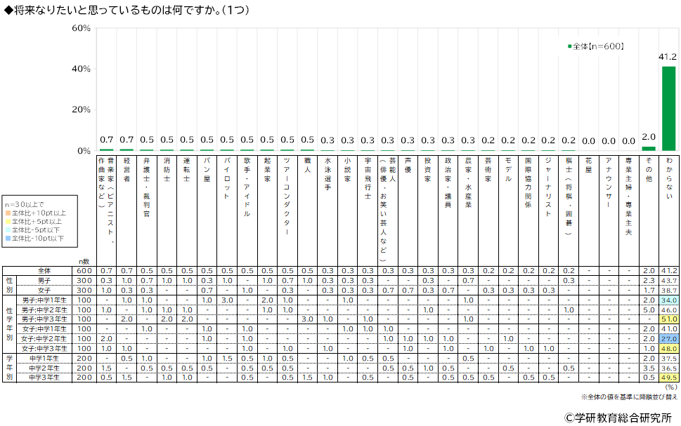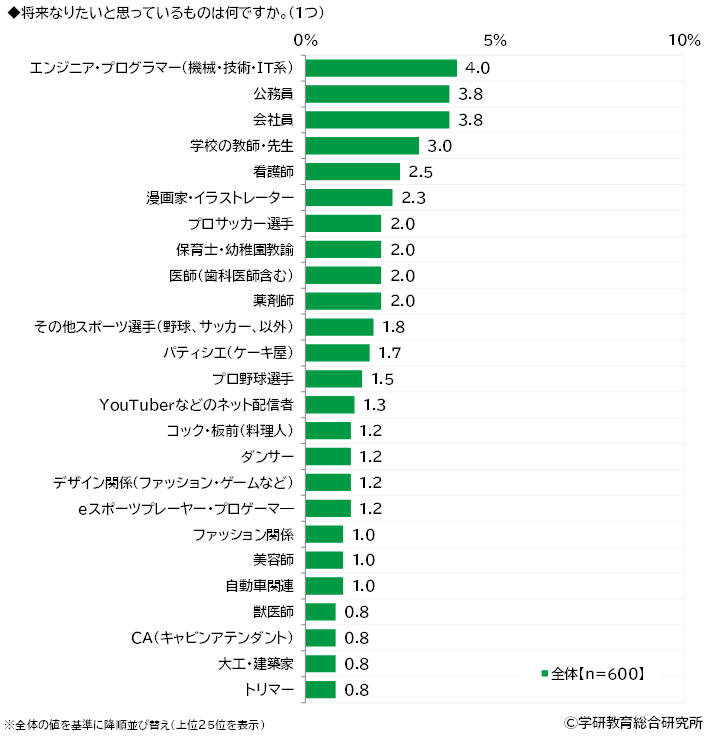 将来なりたいと思っているものをきいたところ1位「エンジニア・プログラマー(機械・技術・IT系)」(4.0%)、2位「公務員」「会社員」(いずれも3.8%)、4位「学校の教師・先生」(3.0%)、5位「看護師」(2.5%)となりました。 「わからない」は41%と小学生31%より10ポイントほど高くなっています。
