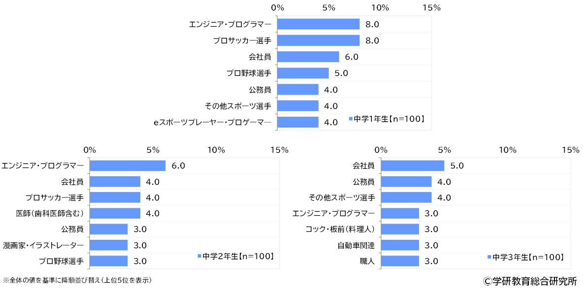 男子についてみると、1位「エンジニア・プログラマー(機械・技術・IT系)」(5.7%)、2位「会社員」(5.0%)、3位「プロサッカー選手」(4.0%)となりました。 学年別にみると、1年生では「エンジニア・プログラマー」と「プロサッカー選手」、と2年生では「エンジニア・プログラマー」、3年生では「会社員」が1位でした。