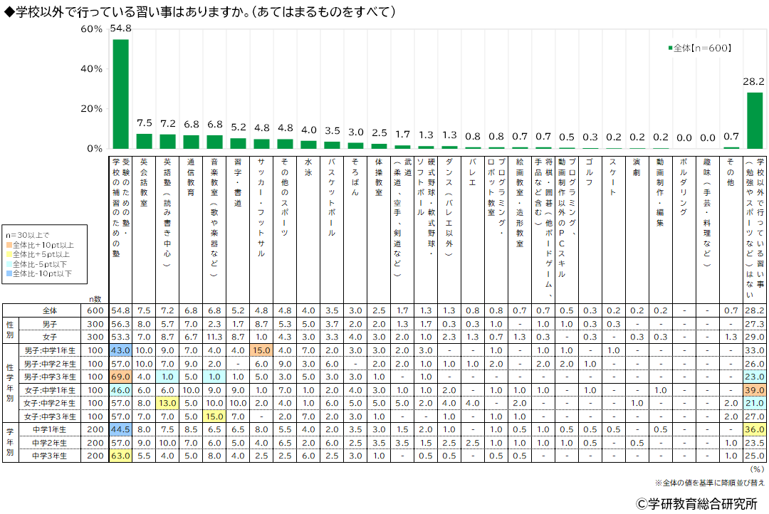前回の2020年調査と比較すると、「受験のための塾・学校の補習のための塾」は前回調査44.5%→今回調査54.8%と、10.3ポイント上昇しました。