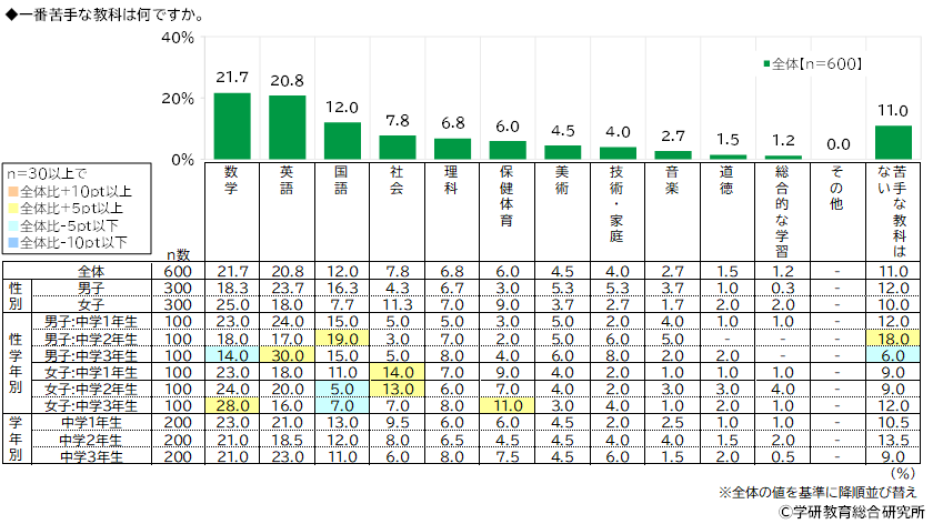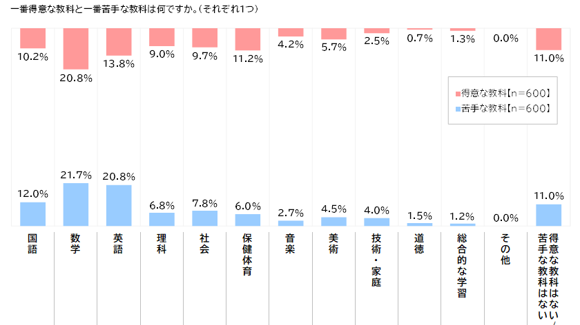 他方、一番苦手な教科をきいたところ、1位「数学」(21.7%)、2位「英語」(20.8%)、3位「国語」(12.0%)、4位「社会」(7.8%)、5位「理科」(6.8%)と、“一番嫌いな教科”と同様に主要5教科がTOP5に挙がりました。