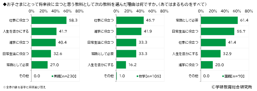 将来役に立つと思う教科のTOP3に挙がった「英語」「数学」「国語」について、将来役に立つと思う教科として選んだ理由をきいたところ、英語と数学では「仕事に役立つ」(英語58.3%、数学45.7%)が1位となりました。英語を自由に使えることや数学的思考力を有していることが仕事で活かされると考えている保護者が多いようです。他方、国語では「常識として必要」(61.4%)が1位となりました。