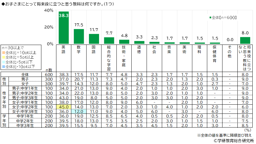 保護者に、子どもにとって将来役に立つと思う教科をきいたところ、「英語」(38.3%)が突出して高くなり、2位「数学」(17.5%)、3位「国語」(11.7%)、4位「総合的な学習」(7.7%)、5位「技術・家庭」(4.8%)と続きました。