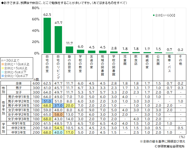 子どもが放課後や休日に、どこで勉強をすることが多いかをきいたところ、「自宅の自室」(62.5%)が最も高くなり、「自宅のリビング」(47.7%)が続きました。自分の部屋や、家族のいるリビングで勉強をしている人が多いようです。次いで高くなったのは、「塾の自習室」(11.7%)、「学校の教室」(6.0%)、「友達の家」「地域の図書館」(いずれも4.5%)でした。