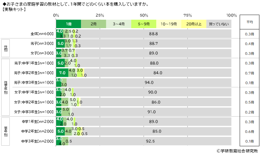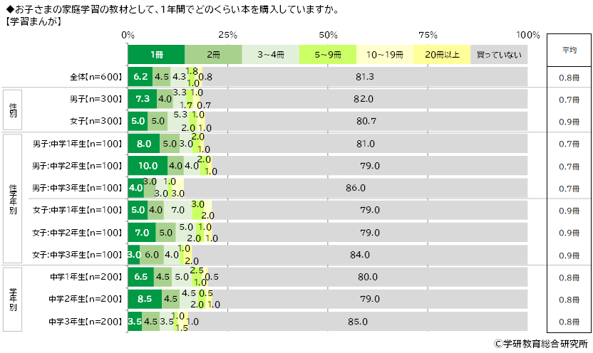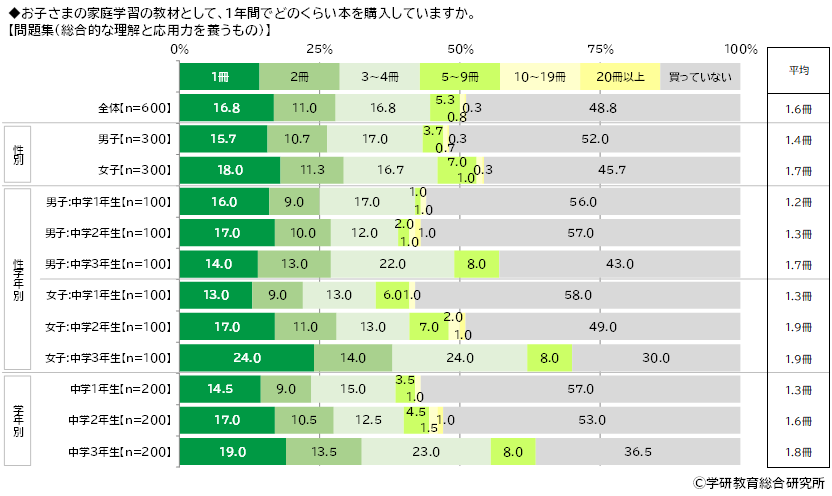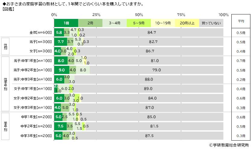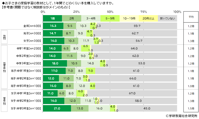 【問題集(総合的な理解と応用力を養うもの)】では平均は1.6冊、【参考書(問題ではなく解説部分がメインのもの)】では平均は1.2冊、【学習まんが】では平均は0.8冊、【実験キット】では平均は0.3冊、【辞典】では平均は0.8冊、【図鑑】では平均は0.5冊でした。