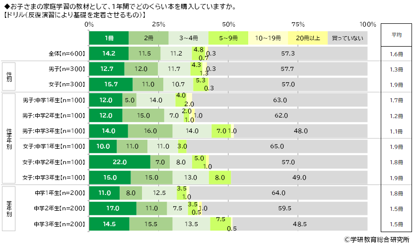 保護者に、子どもの家庭学習の教材として、1年間でどのくらい本を購入しているかをきいたところ、【ドリル(反復演習により基礎を定着させるもの)】では、「1冊」が14.2%、「2冊」が11.5%、「3~4冊」が11.2%となり、「買っていない」は57.3%、購入している冊数の平均は1.6冊となりました。