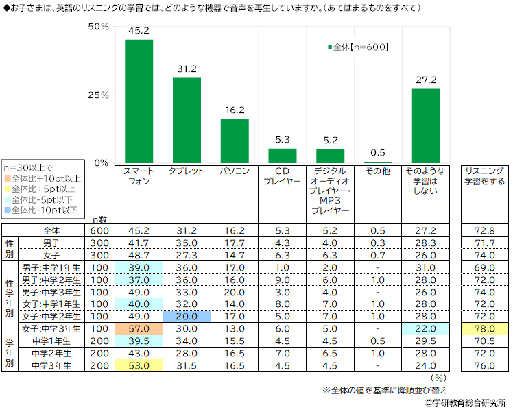 英語のリスニングの学習では、どのような機器で音声を再生しているかをきいたところ、「スマートフォン」(45.2%)が最も高くなり、「タブレット」(31.2%)、「パソコン」(16.2%)と続きました。「そのような学習はしない」は27.2%となり、リスニング学習をする人の割合は72.8%でした。受験対策や英語力向上のために、ふだんの学習にリスニング学習を取り入れている人が多いようです。