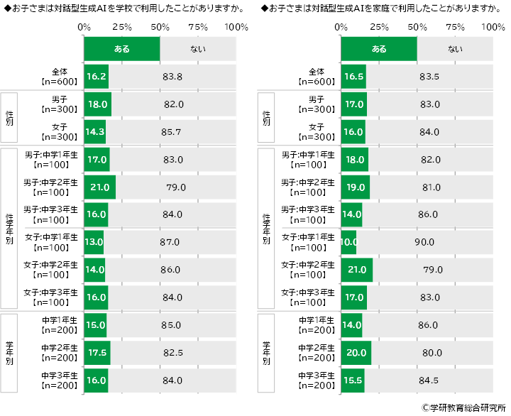 対話型生成AIを学校で利用したことがあるかをきいたところ、「ある」は16.2%、「ない」は83.8%となりました。また、対話型生成AIを家庭で利用したことがあるかをきいたところ、「ある」は16.5%、「ない」は83.5%となりました。