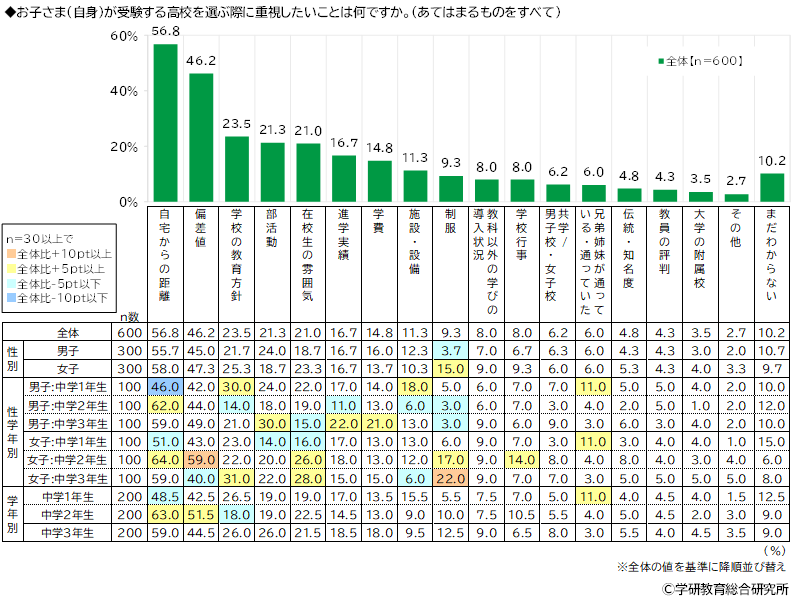 子ども自身が受験する高校を選ぶ際に重視したいことをきいたところ、「自宅からの距離」(56.8%)が最も高くなり、「偏差値」(46.2%)、「学校の教育方針」(23.5%)、「部活動」(21.3%)、「在校生の雰囲気」(21.0%)が続きました。