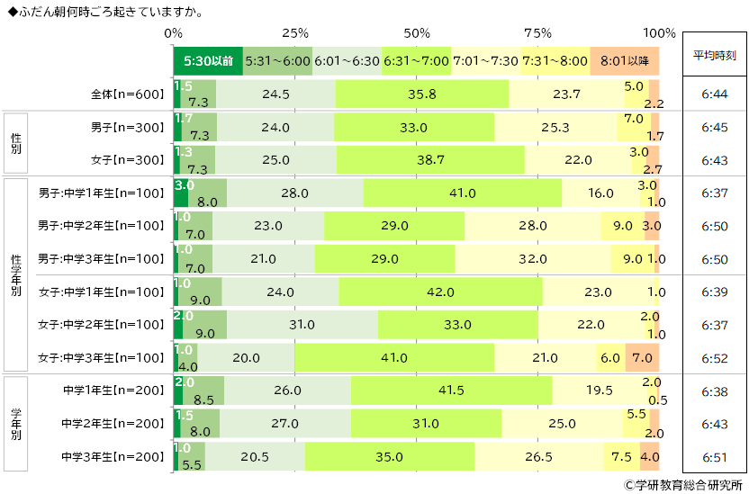 ふだん朝何時ごろ起きているかをきいたところ、「6:01~6:30」(24.5%)や「6:31~7:00」(35.8%)、「7:01~7:30」(23.7%)に回答が集まり、平均時刻は6:44でした。