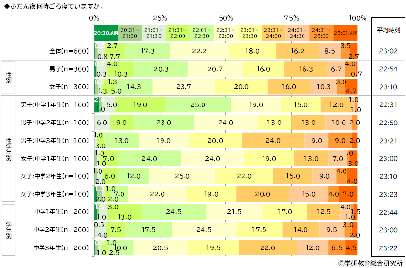 男女別にみると、平均時刻は女子では23:10と、男子(22:54)と比べて16分遅くなりました。
