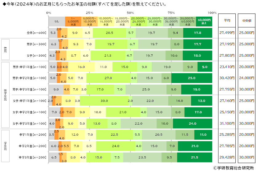今年(2024年)のお正月にもらったお年玉の総額(すべてを足した額)をきいたところ、お年玉をもらった人の割合は94.7%となり、平均は27,499円でした。