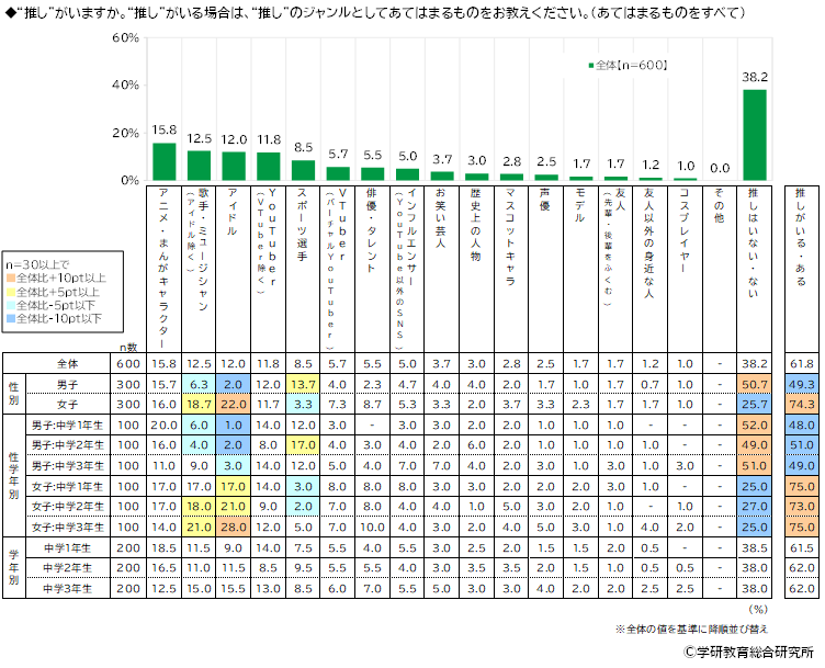 “推し”がいるかどうか、いる場合は“推し”のジャンルとしてあてはまるものをきいたところ、「推しはいない」は38.2%、推しがいる人の割合は61.8%となりました。“推し”のジャンルをみると、1位は「アニメ・まんがキャラクター」(15.8%)、2位は「歌手・ミュージシャン(アイドル除く)」(12.5%)、3位は「アイドル」(12.0%)、4位は「YouTuber(VTuber除く)」(11.8%)、5位は「スポーツ選手」(8.5%)でした。