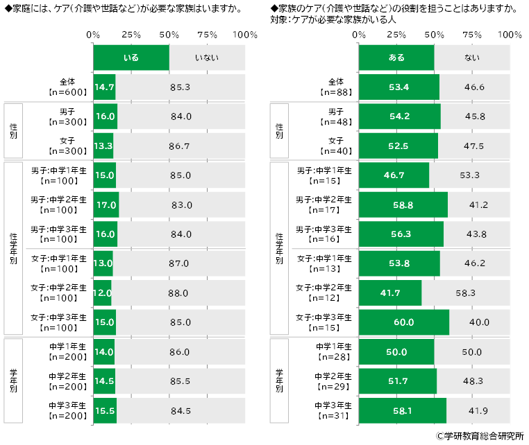 家庭にケア(介護や世話など)が必要な家族はいるかをきいたところ、「いる」は14.7%、「いない」は85.3%となりました。 ケアが必要な家族がいる人(88名)に、家族のケア(介護や世話など)の役割を担うことはあるかをきいたところ、「ある」は53.4%、「ない」は46.6%となりました。