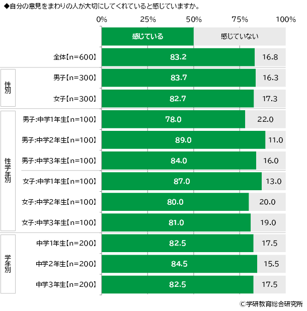 自分の意見をまわりの人が大切にしてくれていると感じているかをきいたところ、「感じている」は83.2%、「感じていない」は16.8%となりました。 男女・学年別にみると、「感じている」と回答した人の割合が最も高くなったのは、男子では2年生(89.0%)、女子では1年生(87.0%)でした。