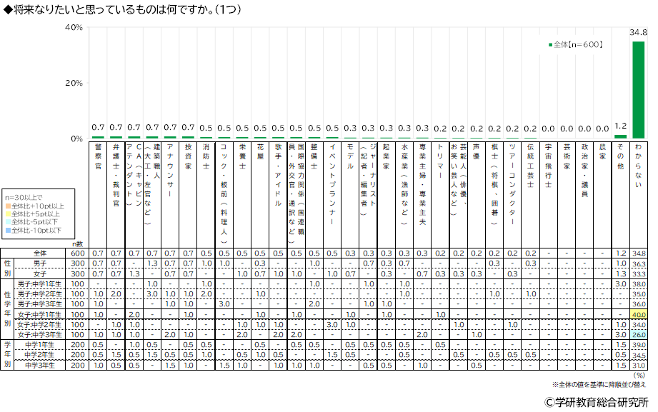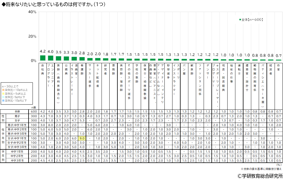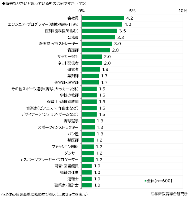 将来なりたいと思っているものをきいたところ、1位「会社員」(4.2%)、2位「エンジニア・プログラマー(機械・技術・IT系)」(4.0%)、3位「医師(歯科医師含む)」(3.5%)、4位「公務員」(3.3%)、5位「漫画家・イラストレーター」(3.0%)となりました。