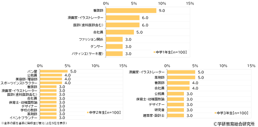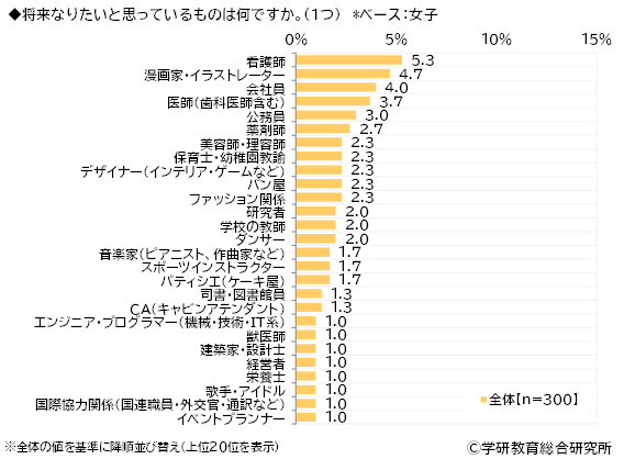 女子についてみると、1位「看護師」(5.3%)、2位「漫画家・イラストレーター」(4.7%)、3位「会社員」(4.0%)となりました。 学年別にみると、1年生では「看護師」が1位、2年生では「パン屋」が1位、3年生では「漫画家・イラストレーター」と「薬剤師」が同率で1位でした。