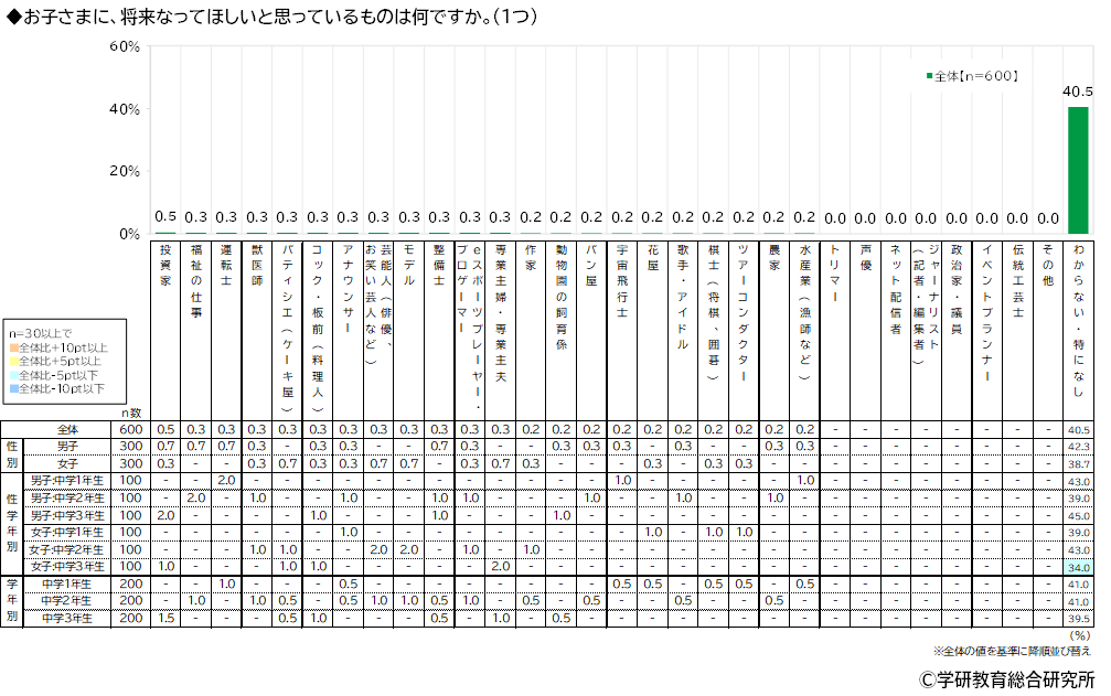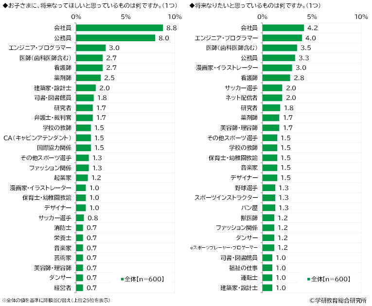 保護者に、子どもに将来なってほしいと思っているものをきいたところ、1位「会社員」(8.8%)、2位「公務員」(8.0%)、3位「エンジニア・プログラマー(機械・技術・IT系)」(3.0%)、4位「医師(歯科医師含む)」「看護師」(いずれも2.7%)となりました。 子ども本人の回答とあわせてみると、子ども本人・保護者のいずれも「会社員」が1位でした。
