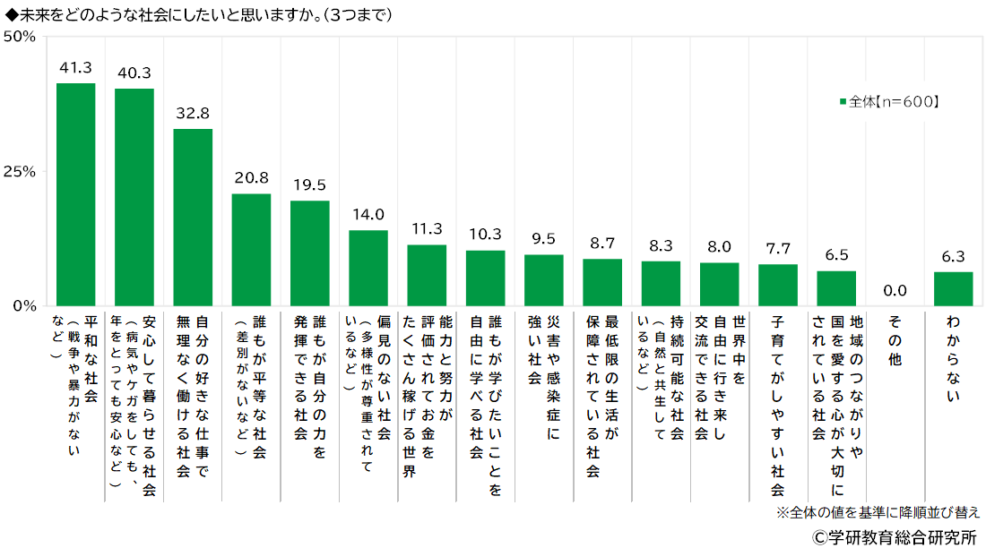未来をどのような社会にしたいと思うかをきいたところ、1位「平和な社会(戦争や暴力がないなど)」(41.3%)、2位「安心して暮らせる社会(病気やケガをしても、年をとっても安心など)」(40.3%)、3位「自分の好きな仕事で無理なく働ける社会」(32.8%)、4位「誰もが平等な社会(差別がないなど)」(20.8%)、5位「誰もが自分の力を発揮できる社会」(19.5%)となりました。