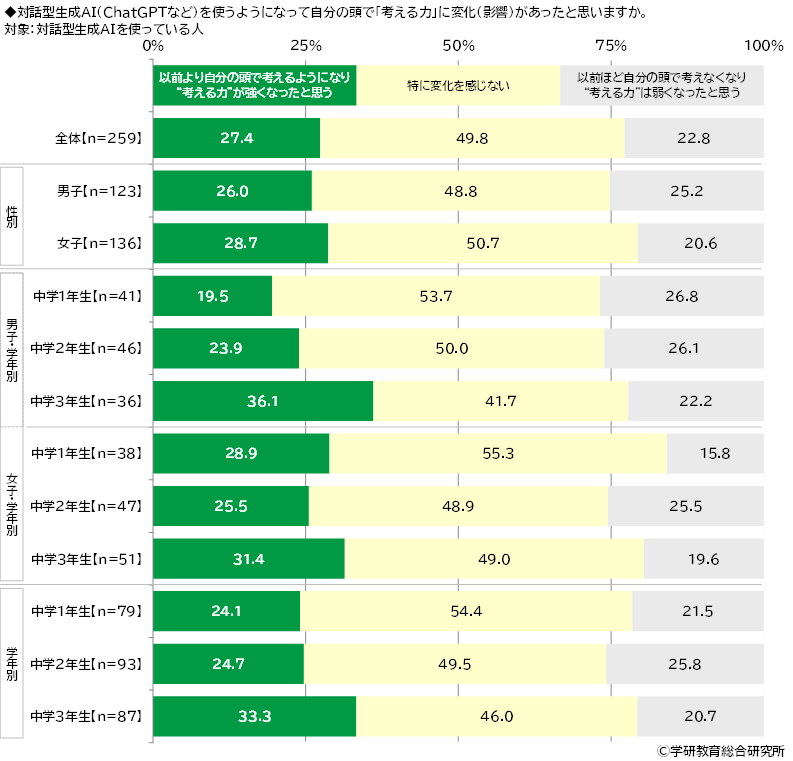 対話型生成AIを使っている人(259名)に、対話型生成AIを使うようになって自分の頭で「考える力」に変化(影響)があったと思うかをきいたところ、「以前より自分の頭で考えるようになり“考える力”が強くなったと思う」は27.4%、「特に変化を感じない」は49.8%、「以前ほど自分の頭で考えなくなり“考える力”は弱くなったと思う」は22.8%となりました。