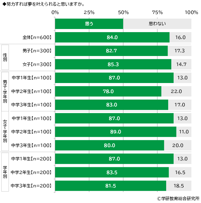 努力すれば夢を叶えられると思うかをきいたところ、「思う」は84.0%、「思わない」は16.0%となりました。