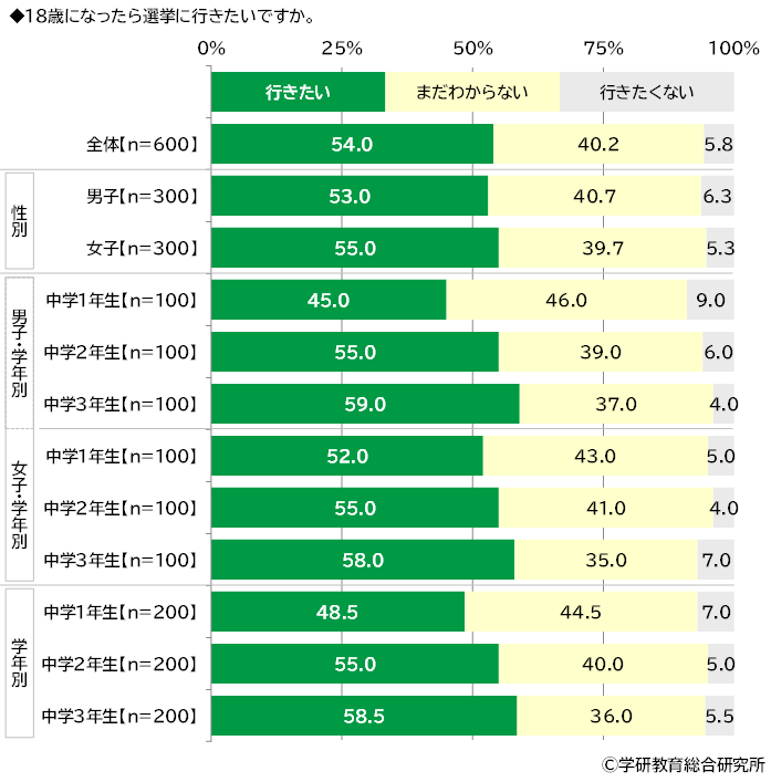 18歳になったら選挙に行きたいかをきいたところ、「行きたい」は54.0%、「まだわからない」は40.2%、「行きたくない」は5.8%となり、半数以上が選挙に行きたいと考えていることがわかりました。 男女・学年別にみると、「行きたい」と回答した人の割合は、男女ともに、学年が上がるにつれて高くなる傾向がみられました。