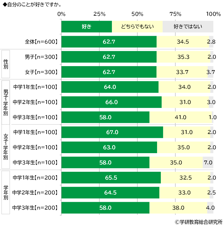自分のことが好きかをきいたところ、「好き」は62.7%、「どちらでもない」は34.5%、「好きではない」は2.8%となりました。