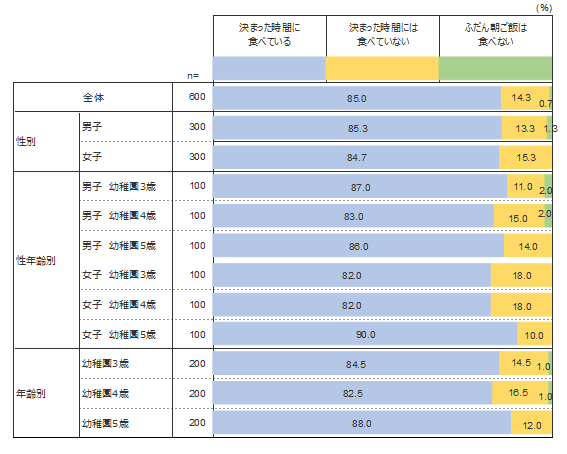 「早寝早起き朝ごはん」運動※1などから、朝食をとることの重要性はよく知られているところである。また、生活リズムを整える上で決まった時間に食事をとることは大切であるが、幼稚園に通っている子どもたちの朝食事情はどうなっているのだろうか。
