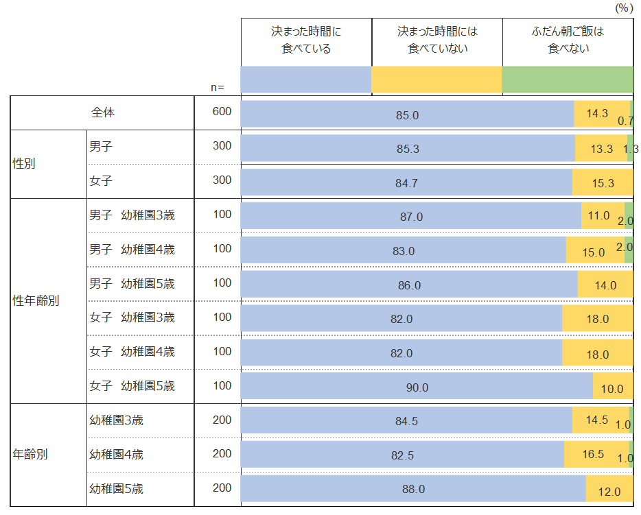 調査の結果をみると、「決まった時間に食べている」(85.0%)割合は保育園に比べて4%ほど低くなるものの、99.3%の子どもたちが朝ごはんを食べているということがわかった。また、「ふだん朝ごはんは食べない」(0.7%)と回答した子どもの割合は低く、女子はどの年齢においても朝ごはんを食べている。保育園の子どもたちは4~5歳にかけて決まった時間に朝ごはんを食べる割合が減っていくが、幼稚園の子どもたちは4~5歳にかけて決まった時間に朝ごはんを食べる子どもが増えていることがわかる。
