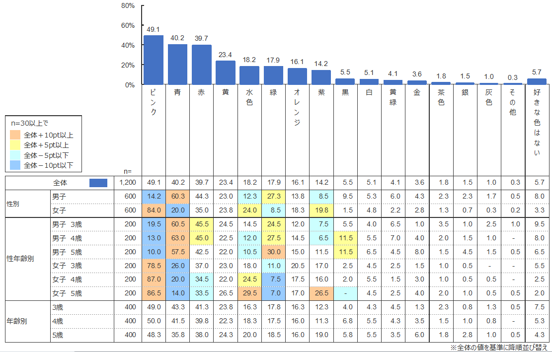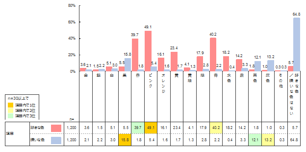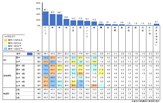 年齢・性別の全体平均でみると、好きな色の1位は「ピンク」(49.1%)、2位「青」(40.2%)、3位「赤」(39.7%)となった。