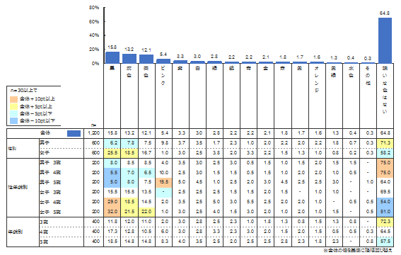 一方、全年齢で嫌いな色は1位「黒」(15.8%)、2位「灰色」(13.2%)、3位「茶色」(12.1%)となった。しかし、最も高い割合となった「嫌いな色はない」は、半数超えの64.8%であった。特に「嫌いな色はない」男子の割合が同年齢の女子に比べて高いことがわかる。