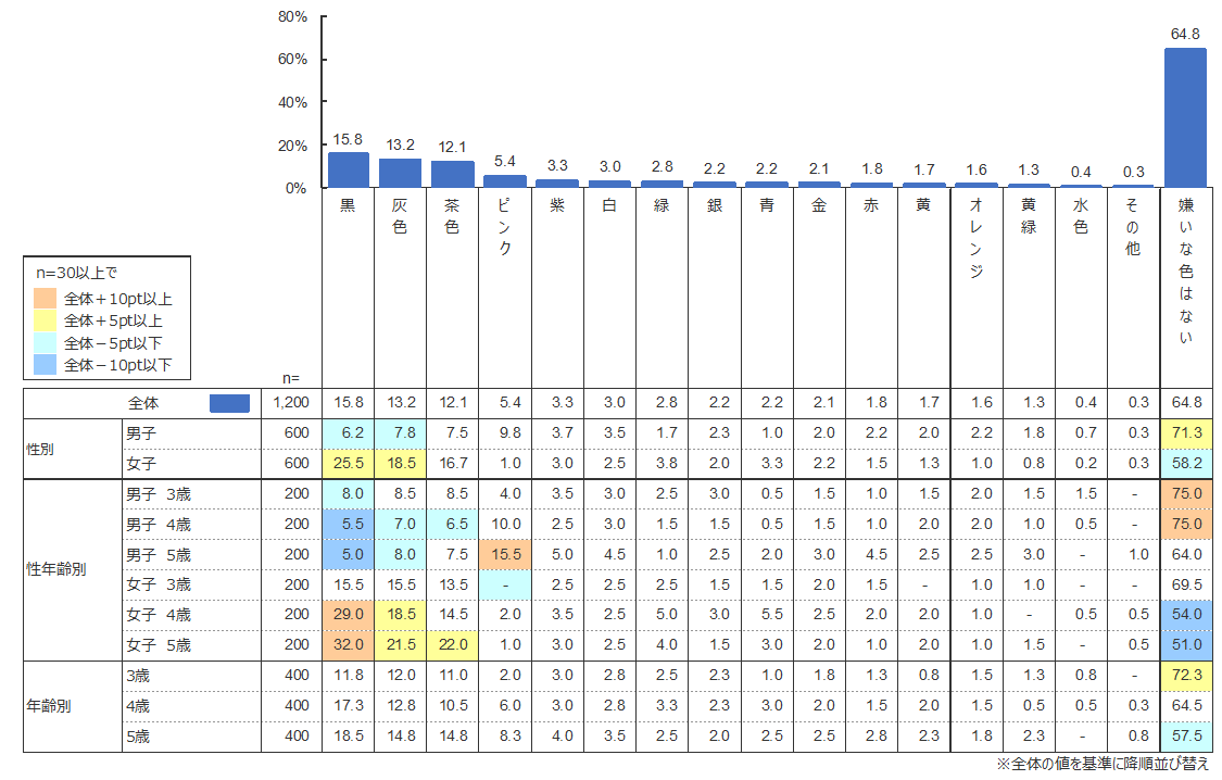 嫌いな色として「黒」「灰色」「茶色」を挙げた4・5歳女子の割合は同年齢の男子に比べて高いことから、女子の方が年齢が上がるにつれて嫌いな色へのこだわりが強くなることがうかがえる。