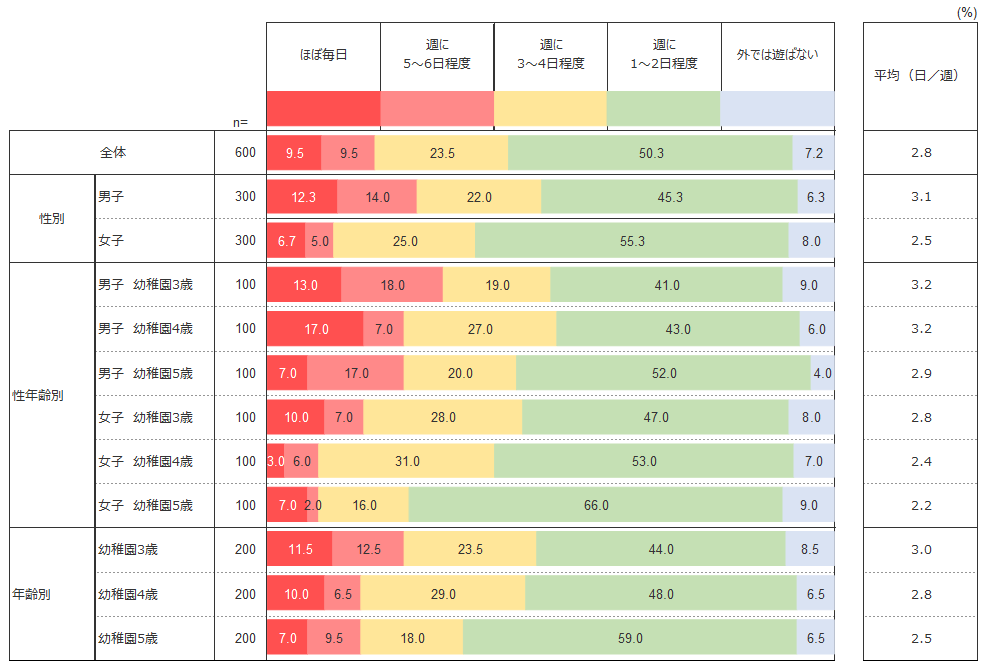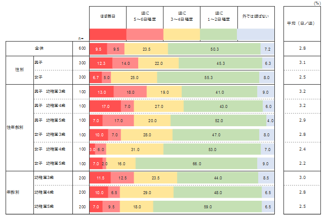 同年齢の保育園児と比べると「週に3~4日程度」の割合が高い一方で「週1~2日程度」の割合が低く、降園時間が保育園児より早い幼稚園児の方が、外で遊ぶ頻度が高くなっている傾向にある。 男女別でみると、男子の方が「ほぼ毎日」外で遊ぶ割合が5.6%高く、1週間での外遊びの平均日数も女子(2.5日)に比べ男子(3.1日)の方が多い。