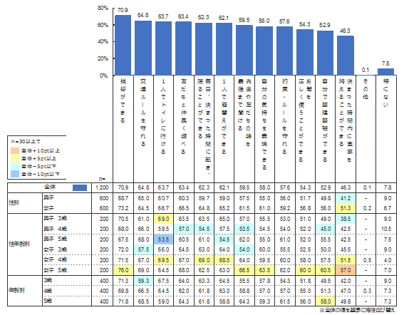 年齢別にみると、それぞれの項目で大きな変化は見られないものの、「交通ルールを守れる」「先生や友だちの話を最後まで聞ける」「約束・ルールを守れる」「自分で整理整頓ができる」等に関しては年齢が上がるにつれて割合が高まっていくことから、小学校入学を控え、学校生活を意識した選択肢が目立つ結果となっている。